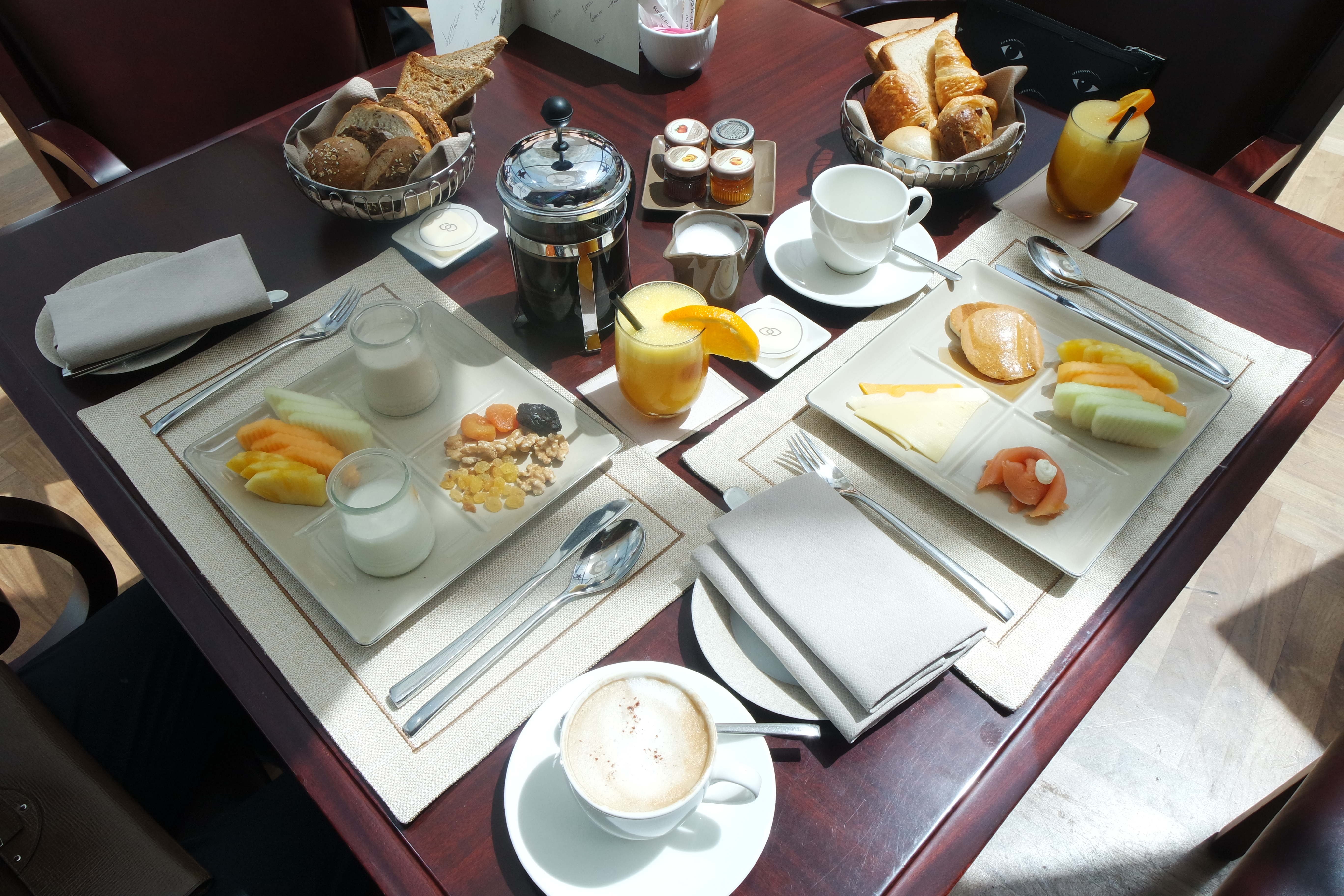 Our starter was served immediately with a selection of fresh sliced fruits, nuts, a freshly baked basket of breads, pressed coffee, juices and some seafood antipasti. It was light and easy to digest.