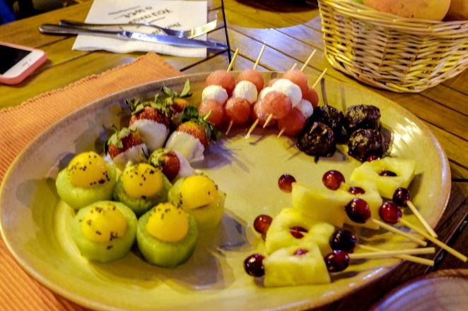 We were given a concoction of Mango and Dragon fruit juice followed by a set of starters that has different combinations that you wouldn’t thought of such. Watermelon and Feta cheese on sticks, Mozzarella cheese covered in dark chocolate, peanut butter crinkle fries sandwich and pineapple, cranberry on sticks. Sounds weird right but definitely very interesting mix of flavors.