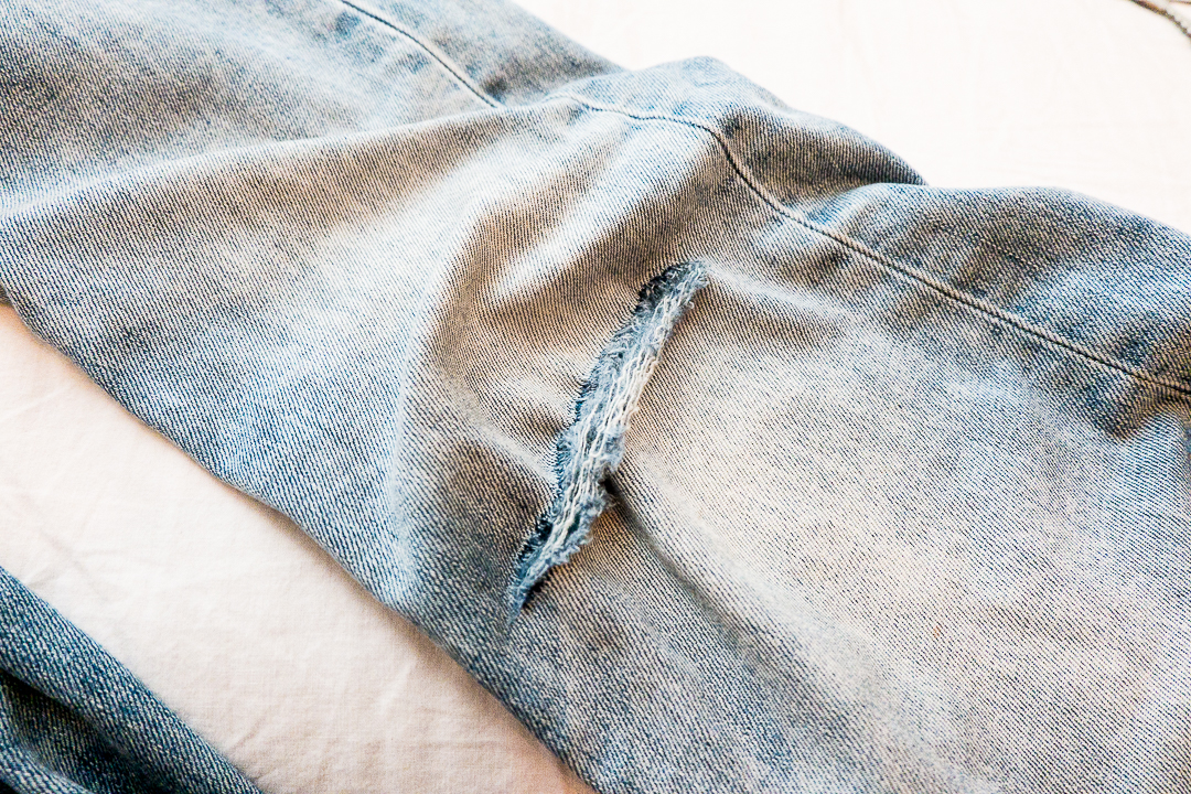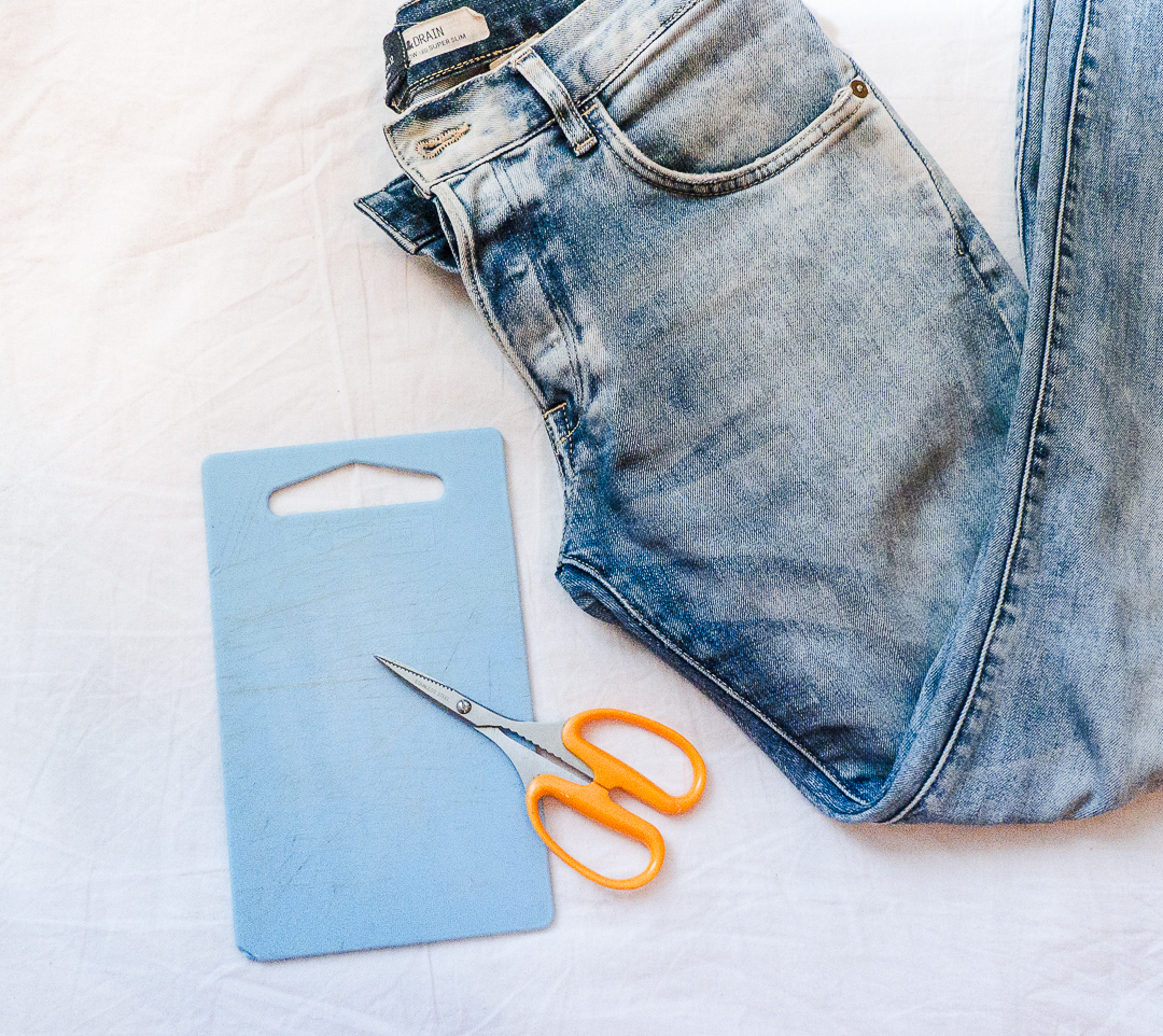 To do this, you’ll want to grab some sandpaper or a paint-removing block, steel wool, and a pumice stone. for the holes, use a pair of super sharp small scissors or a box-cutter. I used chopping board and place it inside the pant legs so that I don’t alter the back of the jean or you can also use a small wooden block – unless you want to.