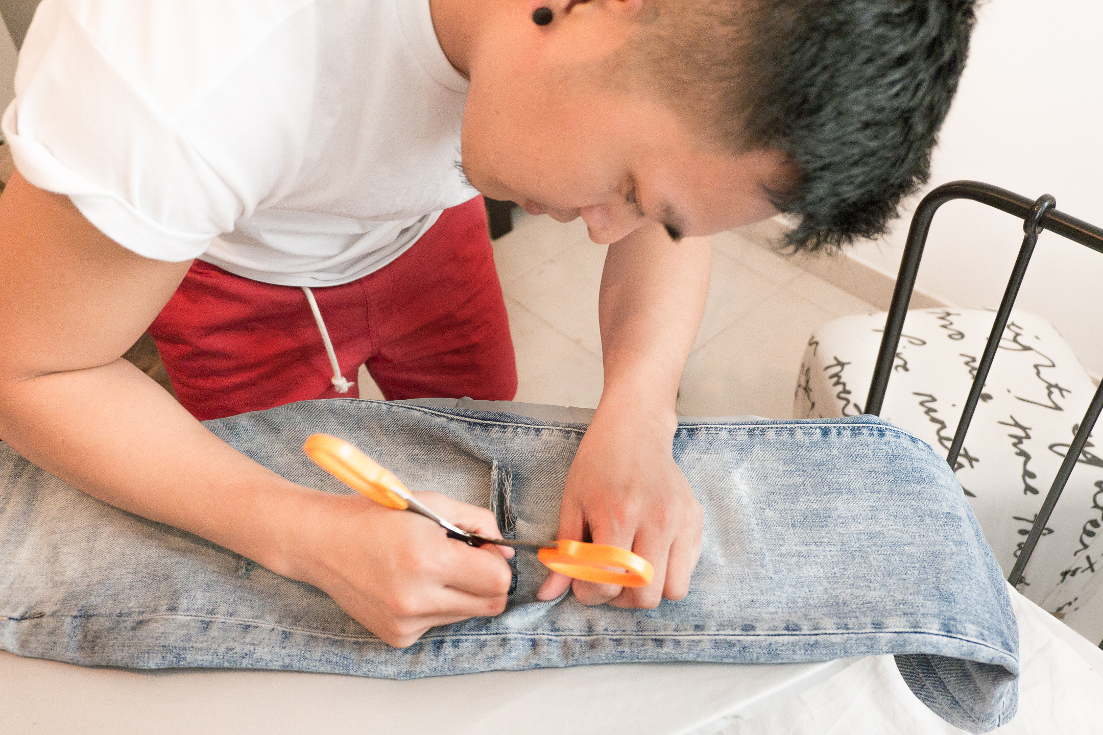 Use a pen, chalk or a safety pin to denote exactly where you want your rips or distressed areas. You might want to grab a ruler, too. What I did is I pinch the area I want to cut. The key is to do this while standing, the pressure from your upper body helps you cut through the threads.